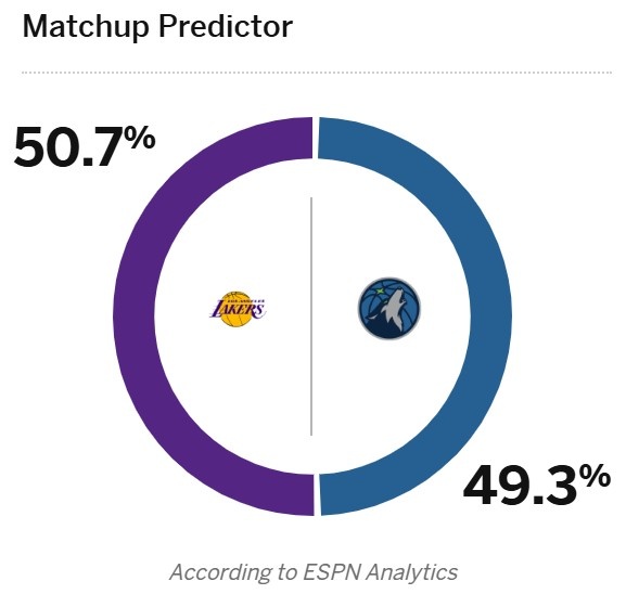 ESPN更新了兩支球隊G4的勝率,其中湖人50.7%略占優勢,森林狼49.3%。